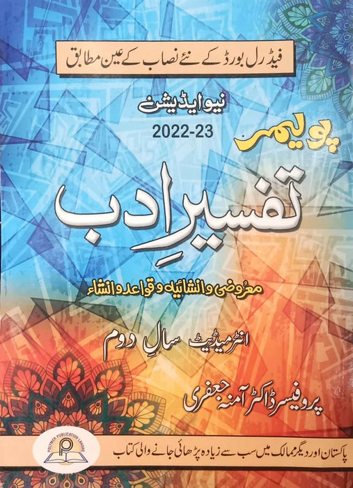 Polymer Tafseer e Adab Federal Board For Intermediate Part-II by Dr. Amna Jafri is a comprehensive textbook designed for intermediate students studying the subject of Urdu literature, specifically tailored for the Federal Board of Education's curriculum. The book offers a detailed analysis and interpretation of classical and modern literary works, aiming to enhance students' understanding of literary concepts, poetry, and prose. Dr. Jafri’s approach combines both subjective and objective methodologies, making the content accessible and engaging for students preparing for their examinations. The text is enriched with detailed explanations, summaries, and insights into key works of Urdu literature, helping students grasp intricate literary elements. The inclusion of objective questions further supports exam preparation, while subjective sections encourage deep reflection and critical analysis, aiding in the development of comprehensive writing skills.