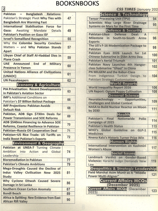 The CSS Times Monthly Current Affairs Magazine (Dec 2025 & Jan 2026) is an indispensable guide for civil services aspirants. Combining detailed analysis, MCQs, and expert insights, it provides a comprehensive view of national and international developments. From military victories and economic challenges to political trends and global affairs, these issues equip readers with the knowledge, analytical skills, and exam readiness required to excel in CSS, PMS, and other competitive exams.