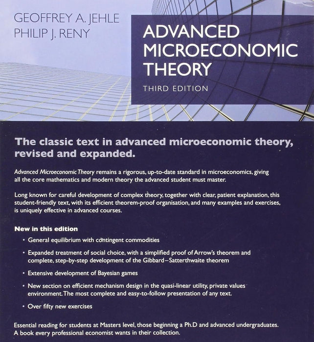 Tags: adverse selection , applied economics , applied microeconomics , competitive equilibrium , competitive markets , consumer theory , cooperative games , cost functions , economics of information , economics of markets , economics of production , economics problem-solving , economics study material , economics textbook , economics theory and applications. , equilibrium concepts , general equilibrium , Geoffrey A Jehle , Geoffrey Jehle , good books , microeconomic foundations , microeconomic strategies , microeconomic theory , microeconomics models , microeconomics study , microeconomics textbook , moral hazard , Nash equilibrium , non-cooperative games , optimization in economics , Philip J Reny , Philip Reny , producer theory , production functions , production theory , quantitative economics , rigorous economics , strategic behavior in economics , strategic interactions , theoretical economics , theoretical microeconomics , undergraduate economics , utility maximization , welfare analysis , welfare economics