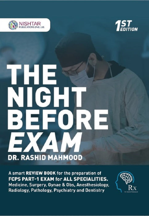 Nishtar The Night Before Exam, 1st Edition by Dr. Rashid Mahmood is a focused and strategic review guide designed to help candidates prepare for the FCPS Part 1 exam across various specialties, including Medicine, Surgery, Gynaecology & Obstetrics, Anesthesiology, Radiology, Pathology, Psychiatry, and Dentistry. This book serves as a quick revision tool, providing key concepts, high-yield topics, and exam-focused material that is essential for last-minute preparation. It simplifies complex topics into concise, easy-to-understand summaries, allowing candidates to review effectively in a short amount of time. With its smart approach to studying, this book is perfect for those looking to optimize their revision just before the exam, offering critical insights and helping candidates gain confidence in their preparation.
