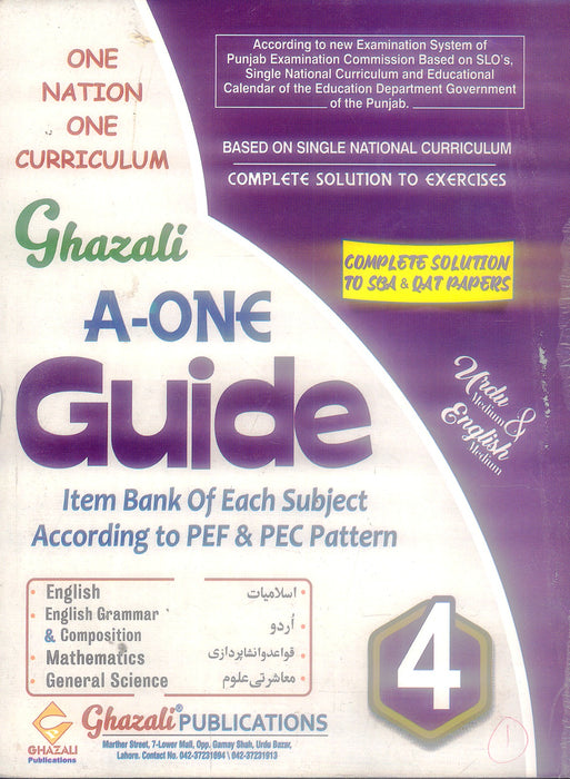 Ghazali A One Guide Class 4 is a comprehensive and well-structured study resource. By providing complete solutions, adherence to the Single National Curriculum, and preparation based on SLOs, the guide ensures that students are fully equipped to excel in the PEC exams.