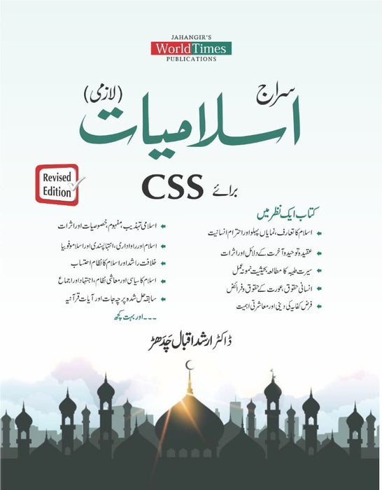 Siraj Islamiyat Lazmi For CSS by Dr. Arshad Iqbal Chaddar, published by Jahangir's World Times (JWT), is a comprehensive guide tailored for candidates preparing for the Islamiyat portion of the CSS (Central Superior Services) exams in Pakistan. The book provides an in-depth understanding of Islamic principles, teachings, and history, with a specific focus on topics frequently asked in the CSS exams. It covers key aspects of Islam, including the Quran, Hadith, Islamic law, and contemporary Islamic issues, aiming to equip students with the necessary knowledge to excel in the competitive exam. The author’s approach combines scholarly insights with exam-oriented material, ensuring students gain both conceptual clarity and practical skills. This book is an essential resource for anyone aiming to master the Islamiyat section of the CSS exam.