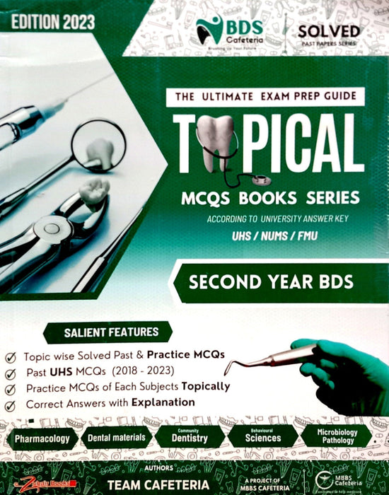 BDS Cafeteria Topical MCQs Books Series 2nd Year BDS (Solved Past Papers Series) by Muhammad Rafay Ur Rehman, published by Zubair Book Depot, is a comprehensive study guide designed to help BDS students prepare for their exams. This ultimate exam prep guide follows the University Answer Key and is aligned with the latest UHS, NUMS, and FMU syllabi. It includes a collection of topic-wise solved past and practice MCQs from 2018 to 2023, covering essential subjects like Pharmacology, Dental Materials, Dentistry Sciences, and Microbiology Pathology. The book offers practice MCQs for each subject, organized by topics, with correct answers accompanied by detailed explanations. This approach not only helps students understand the material but also equips them with the tools needed to succeed in their exams.