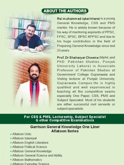 "Aflatoon One Liner Pakistan Studies" by Prof Dr Shaharyar Cheema and Rai Muhammad Iqbal Kharal is a concise yet comprehensive resource designed to aid students in mastering Pakistan's history, politics, and culture. With the expertise of both authors, this book offers succinct insights into diverse topics essential for understanding the complexities of Pakistan's socio-political landscape. Whether you're preparing for competitive exams or simply seeking a quick reference guide, this book provides valuable information in easily digestible one-liners.