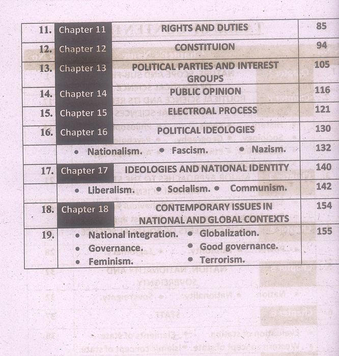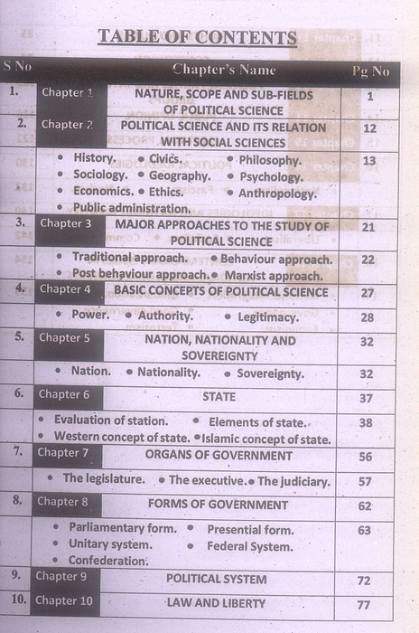 Divided into clear sections: Principles of Political Science, Dynamics of Political Science, and Study of Political Science. -