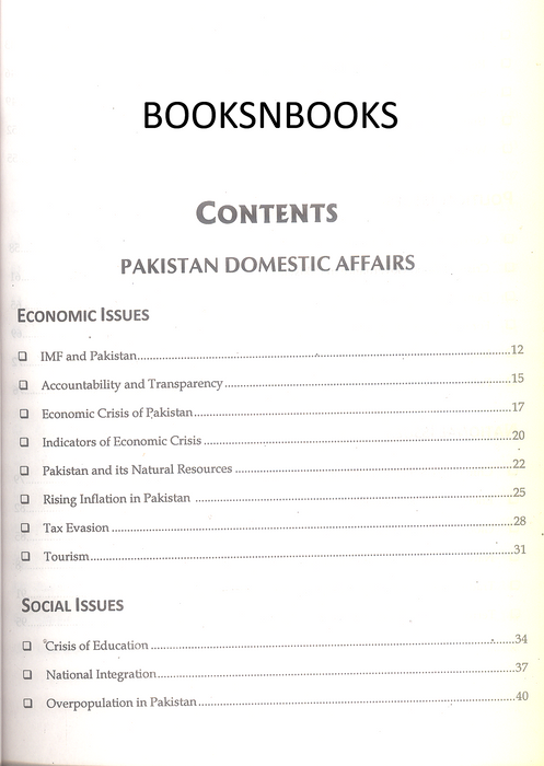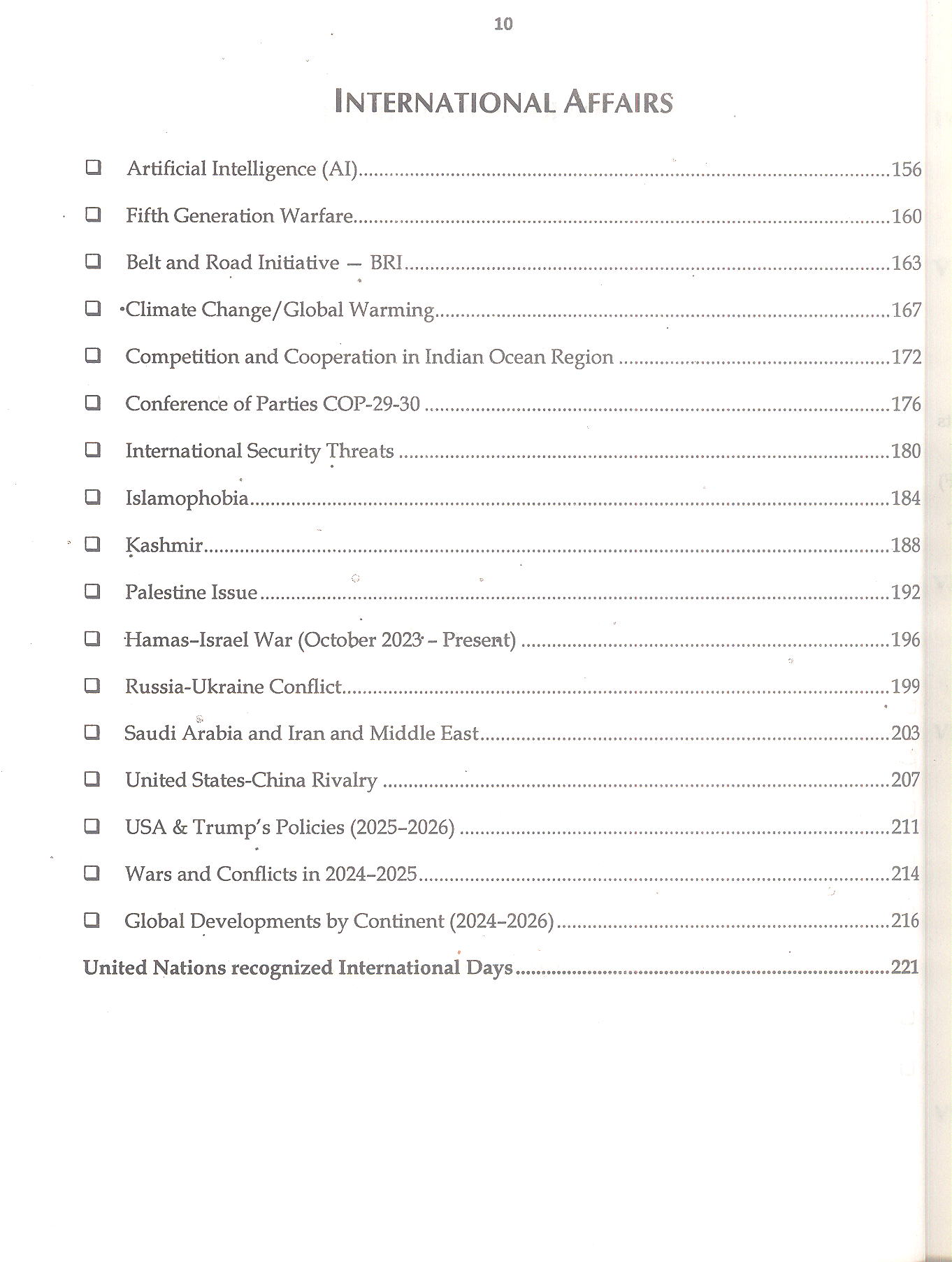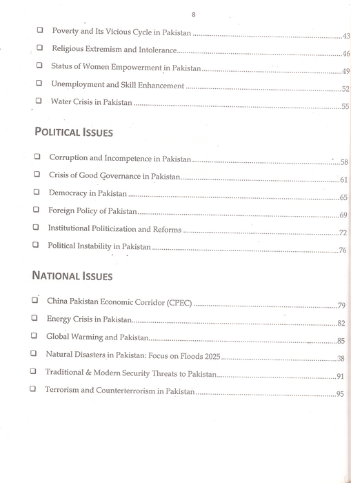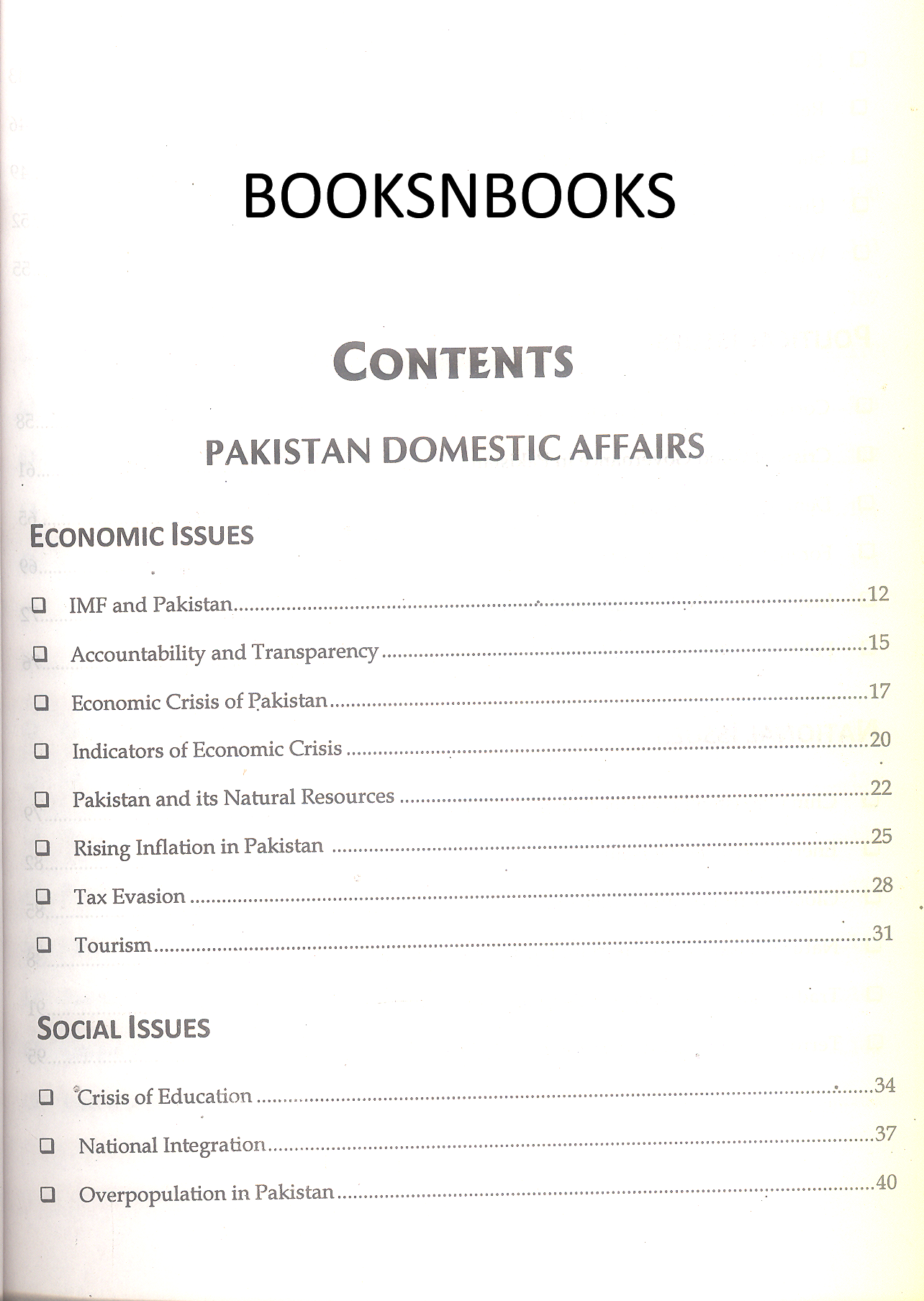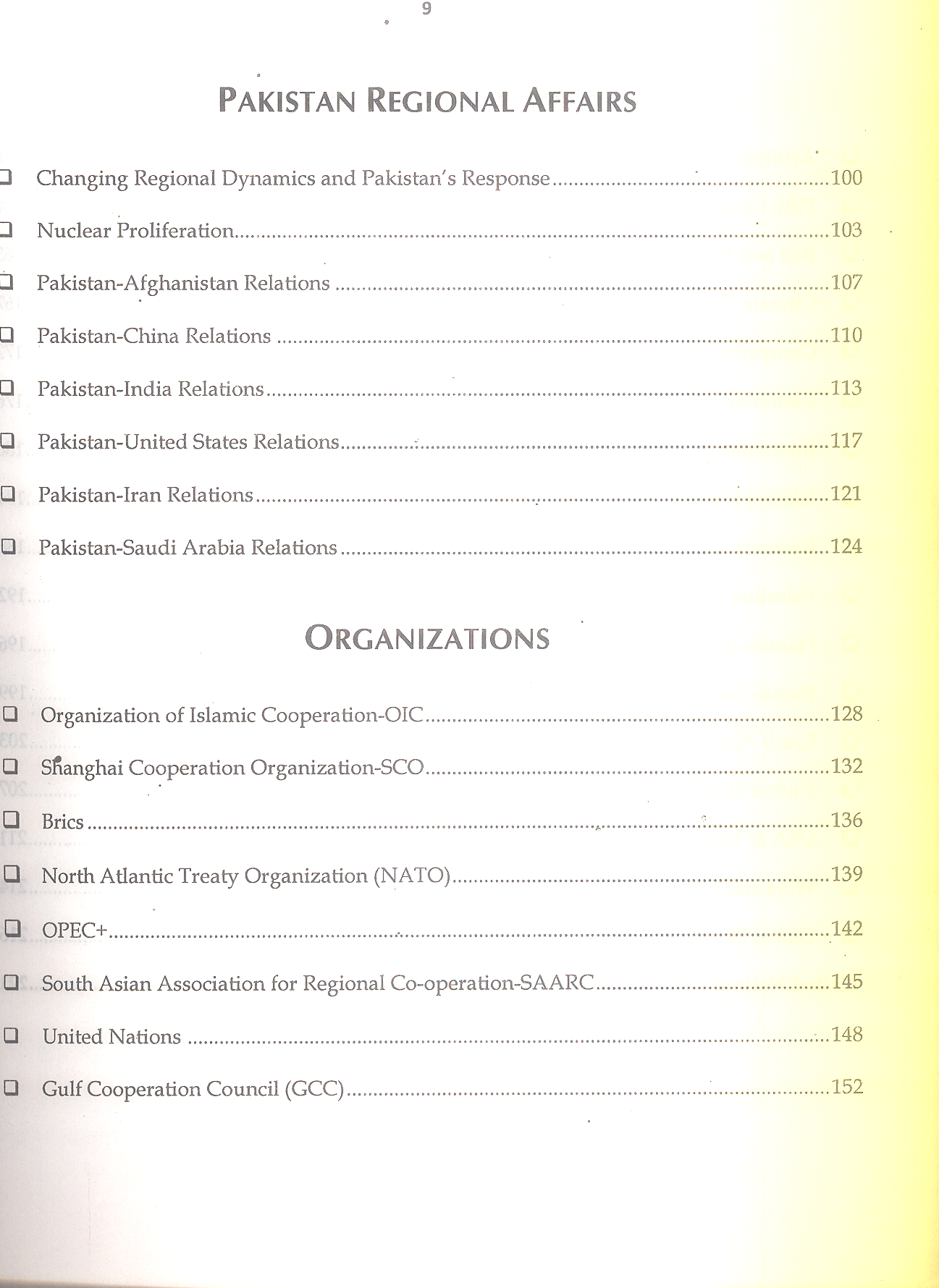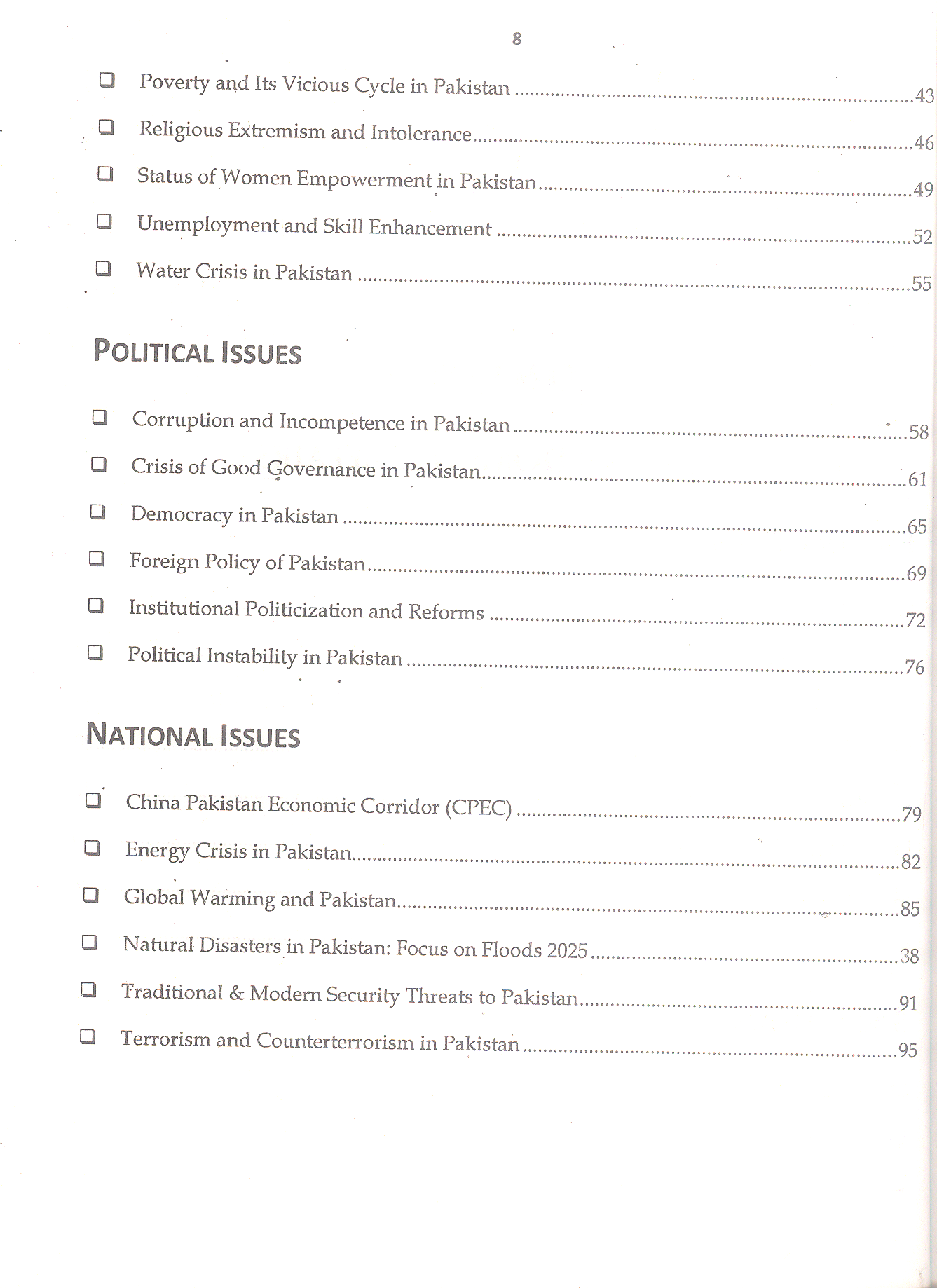Structured outlines for essay, current affairs, international relations & Pakistan affairs papers.