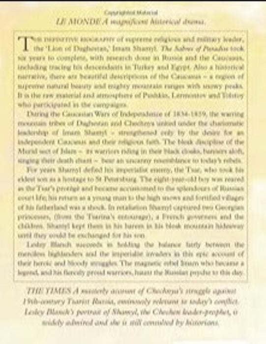 "The Sabres of Paradise" by Lesley Blanch is a captivating account of the Caucasus resistance against Russian expansion, offering a nuanced perspective on the cultural, political, and historical dynamics of the region. Through its vivid storytelling and insightful analysis, Blanch's work not only illuminates the heroic struggle of Imam Shamil and his followers but also underscores the broader implications of colonial encounters and resistance movements in shaping regional identities and geopolitical landscapes. This book is essential reading for anyone interested in understanding the complex history of the Caucasus and its enduring influence on contemporary issues.