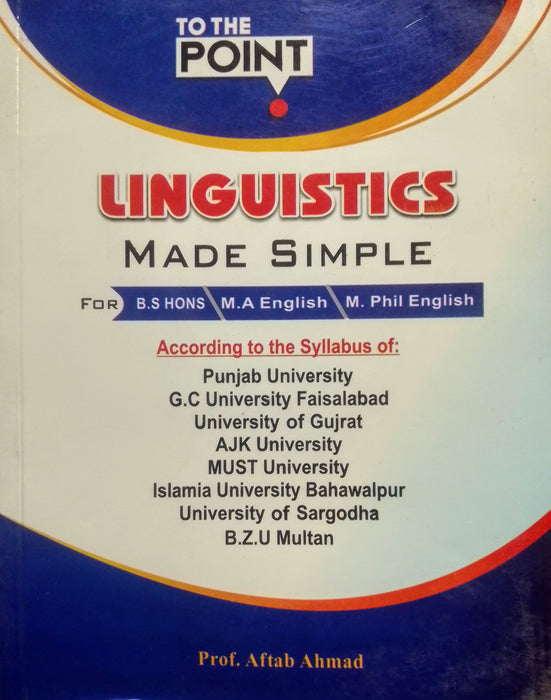 To The Point Linguistics Made Simple by Prof. Aftab Ahmad is a focused guide tailored for students pursuing BS Honors, MA English, and M.Phil in Linguistics, aligned with the syllabi of universities across Pakistan. This book provides concise and accessible content, designed to cover the core concepts of linguistics in a clear, structured format. It is an invaluable resource for students needing a streamlined approach to complex topics, offering explanations, examples, and insights relevant to the curriculum.