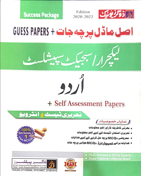 The "Urdu Lecturer & Subject Specialist Guide" by Dogar Publishers is an essential tool for candidates aiming to excel in competitive exams for lecturer and subject specialist positions. With its blend of guess papers, self-assessment materials, and in-depth subject coverage, it ensures a thorough and exam-focused preparation experience.