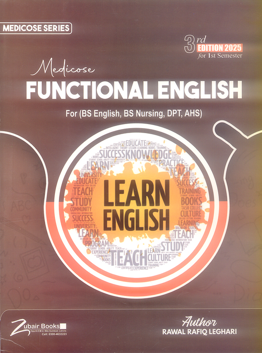 "Medicose Functional English (3rd  Edition 2025)" by Rawal Rafiq Leghari is a specialized textbook designed for students pursuing BS English, BS Nursing, DPT (Doctor of Physical Therapy), and Allied Health Sciences (AHS). Published by Zubair Book Depot, this book aims to enhance students' proficiency in English, focusing on the functional aspects of the language relevant to their academic and professional needs.