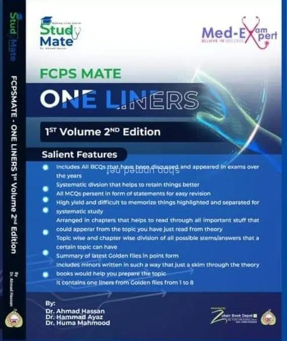 Study Mate Med Exam Expert FCPS Mate One Liners, 1st Vol, 2nd Edition by Ahmad Hassan and Hammad Ayyaz is a focused guide designed to assist medical students and professionals preparing for the FCPS (Fellowship of the College of Physicians and Surgeons) exams in Pakistan. This book presents high-yield, concise one-liners that cover essential topics and facts, ideal for rapid review and last-minute preparation. The format emphasizes quick recall, helping students retain key information efficiently.