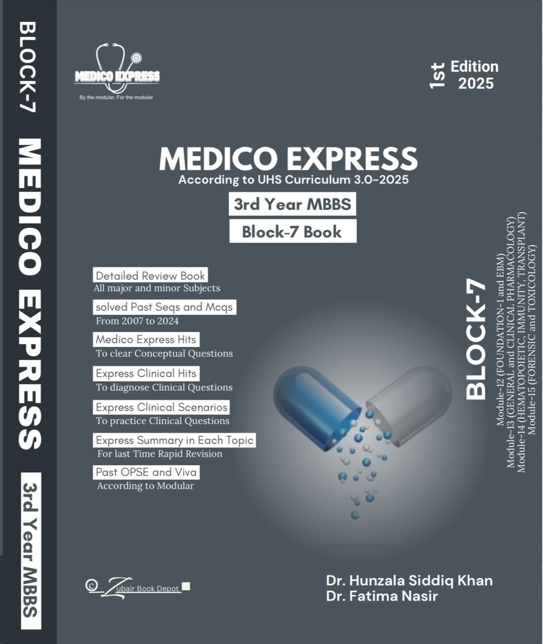 Tags: 3rd Year MBBS , Block 07 , Block 7 Book , Block-7 , Clinical Questions Practice , Clinical Scenarios MBBS , Dr. Fatima Nasir , Dr. Hunzala Siddiq Khan , EBM MBBS , Forensic and Toxicology , Hematology MBBS , Hunzala Siddiq Khan , MBBS 2025 , Medical Review Book , Medico Express , Medico Express Hits , Modular System MBBS , Past OPSE and Viva , Pharmacology MBBS , Rapid Revision MBBS , SEQs and MCQs Solved , UHS 3rd Year Guide , UHS Curriculum 3.0 , Zubair Book Depot