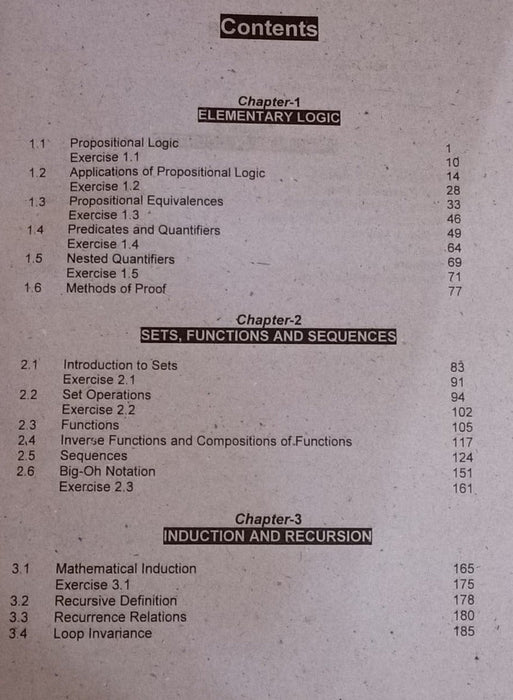 • Fundamental Concepts – Covers logic, sets, functions, relations, matrices, Boolean algebra, and graph theory.