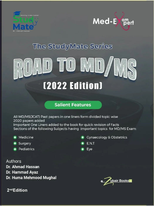 Study Mate (Med Exam Expert) Road to MD MS 2nd Edition by Dr. Ahmad Hassan, Dr. Hammad Ayaz, and Dr. Huma Mehmood Mughal, published by Zubair Book Depot, is an essential resource for students preparing for MD/MS exams, particularly the JCAT (Joint College of Physicians and Surgeons) examination. This book compiles all the important MD/MS past papers in one-liner format, divided topic-wise for focused revision. It includes key one-liners for quick recall of important facts, making it ideal for last-minute revision. The book covers crucial topics from Medicine, Surgery, Pediatrics, Gynaecology & Obstetrics, ENT, and Eye, ensuring comprehensive preparation. Its structured approach to key subjects and topics helps streamline the preparation process for aspiring medical professionals.